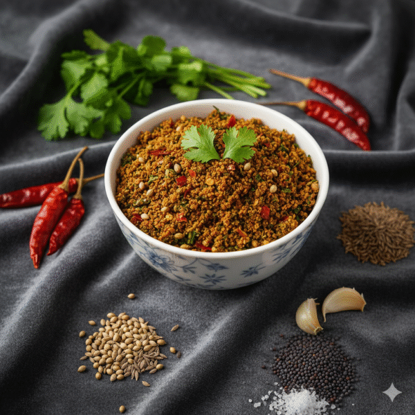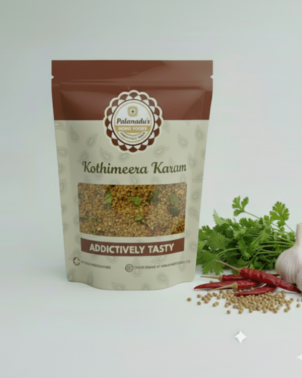Kothimeera Karam is a flavorful Andhra-style spice blend made from fresh coriander leaves, green chilies, garlic, and select spices. Known for its unique aroma and tangy-spicy taste, it is a versatile chutney powder that pairs perfectly with hot rice, ghee, idli, dosa, or even roti. Prepared using traditional methods, it retains the natural freshness of coriander while enhancing every meal with a burst of flavor. Free from preservatives and made in hygienic conditions, Kothimeera Karam brings home the authentic taste of Andhra kitchens. A must-have for spice lovers who enjoy a perfect balance of freshness and heat.